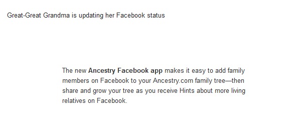 I recently got an e-mail from Ancestry.com with the subject, “GG-Grandma Is Updating Her Facebook Status.” Clicking open the message what followed was this:
